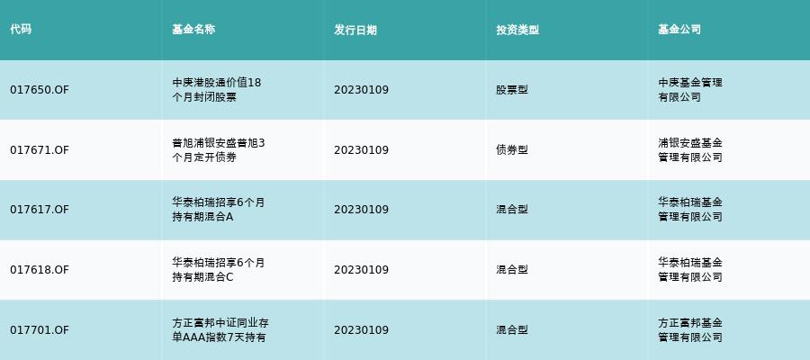 1月9日,有5只新基金发行,分别为:中庚港股通价值18个月封闭股票、普旭浦银安盛普旭3个月定开债券、华泰柏瑞招享6个月持有期混合A、华泰柏瑞招享6个月持有期混合C、方正富邦中证同业存单AAA指数7天持有,详情见下表: