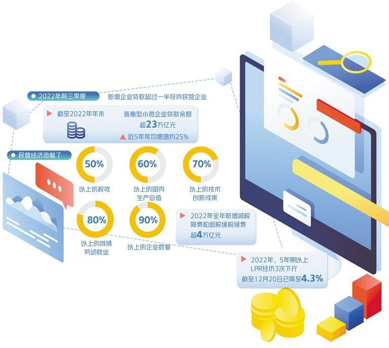 “我国企业绝大多数是民营企业,而民营企业绝大多数又是小微企业。”中国人民银行党委书记、中国银保监会主席郭树清表示。最新统计数据显示,2022年前三季度,新增企业贷款超过一半投向民营企业;截至2022年年末,普惠型小微企业贷款余额超23万亿元,近5年年均增速约25%,远高于其他国家,贷款利率也在持续下降。