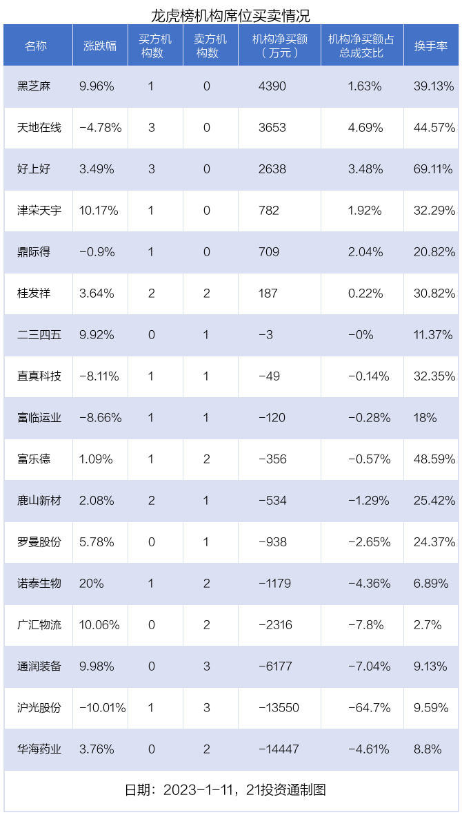 1月11日,17只个股龙虎榜出现了机构的身影,机构合计净卖出2.73亿元。具体来看,机构净买入6股,净卖出11股。