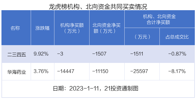 值得注意的是,机构和北向资金共同净卖出了二三四五、华海药业。
