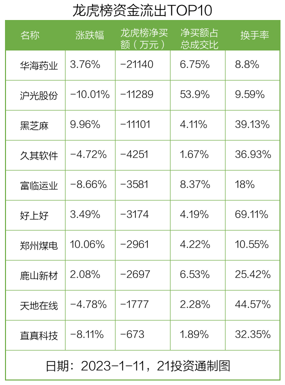 而龙虎榜中资金净流出最多的是华海药业(600521.SH),被净卖出为2.11亿元,占总成交金额的6.75%。华海药业收盘上涨3.76%,换手率为8.8%。