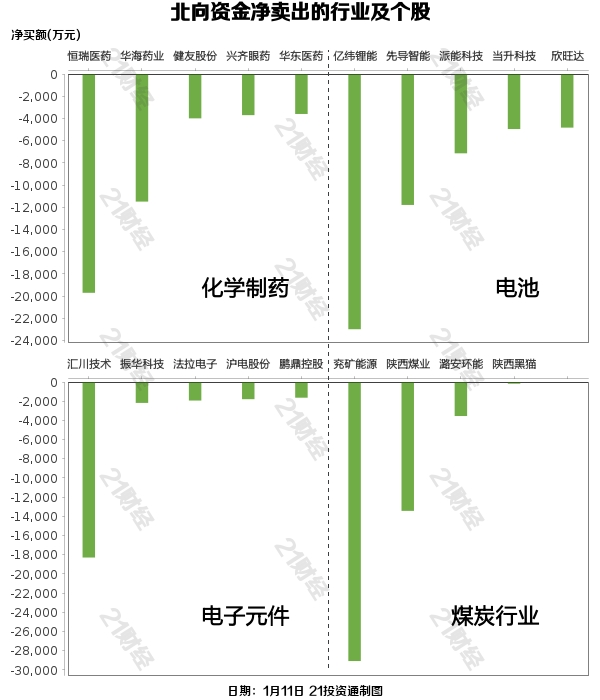 北向资金减持了36个行业,其中化学制药最多,净卖出金额达3.89亿元,其次是电池行业,净卖出3.00亿元。