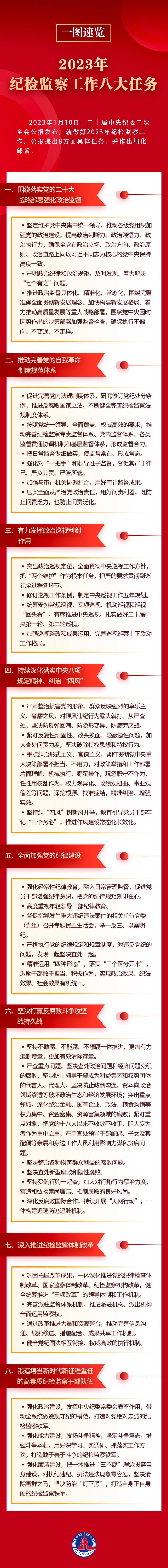 2023年1月10日,二十届中央纪委二次全会公报发布。就做好2023年纪检监察工作,公报提出8方面具体任务,并作出细化部署。详情请看↓↓↓