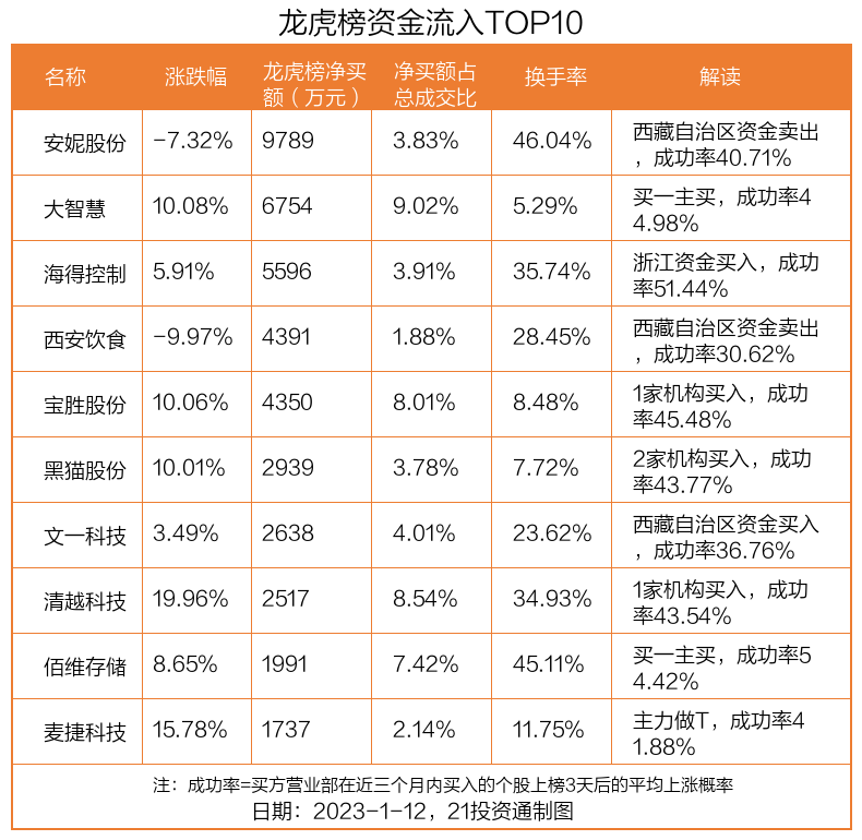 1月12日,上证指数上涨0.05%,深证成指上涨0.23%,创业板指上涨0.51%。盘后龙虎榜数据显示,共有32只个股因当日异动登上龙虎榜,资金净流入最多的是安妮股份(002235.SZ),达0.98亿元。
