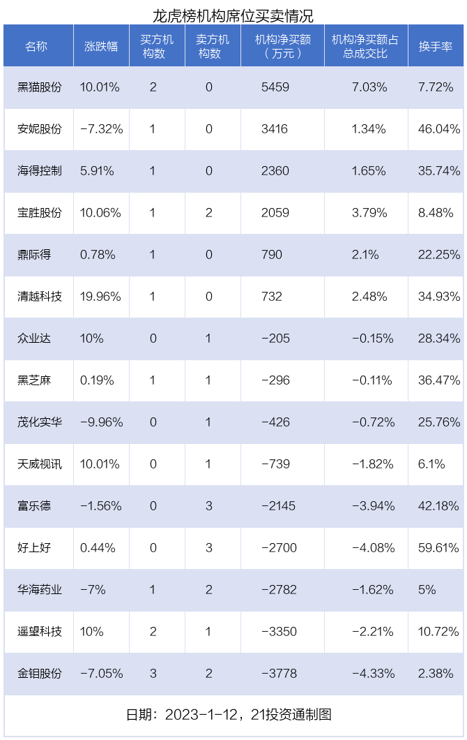 其中,机构净买入金额最多的是黑猫股份(002068.SZ),当日收盘上涨10.01%,换手率为7.72%。