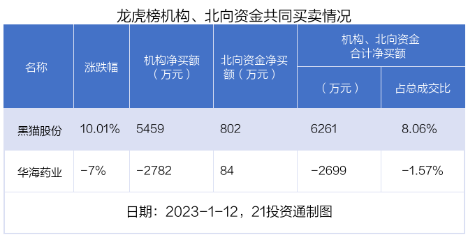 值得注意的是,机构和北向资金共同净买入了黑猫股份;在华海药业上出现分歧,机构净卖出华海药业2782.46万元,北向资金净买入83.9万元。