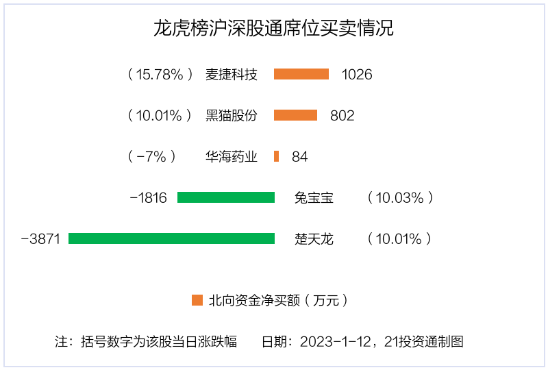 1月12日,北向资金参与龙虎榜中的个股共有5只,合计净卖出3774.68万元。其中沪股通净买入1股,金额为83.9万元;深股通净买入2股,净卖出2股,合计金额为3858.58万元。