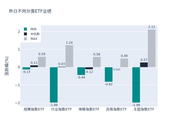 昨日股票型ETF收益率中位数为0.13%。其中按照不同分类,规模指数中嘉实创业板增强策略ETF收益率最高,为0.59%;行业指数中南方中证新能源ETF收益率最高,为1.24%;策略指数中华安创业板50ETF收益率最高,为0.58%;风格指数中300成长收益率最高,为0.49%;主题指数中兴银国证新能源车电池ETF收益率最高,为2.12%。