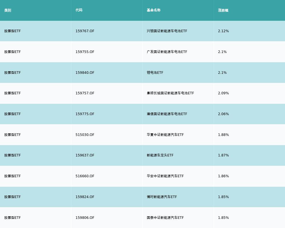 昨日股票型ETF涨幅最高的3支ETF及其收益率分别为:兴银国证新能源车电池ETF(2.12%)、广发国证新能源车电池ETF(2.1%)、锂电池ETF(2.1%)。涨幅前10详情见下表: