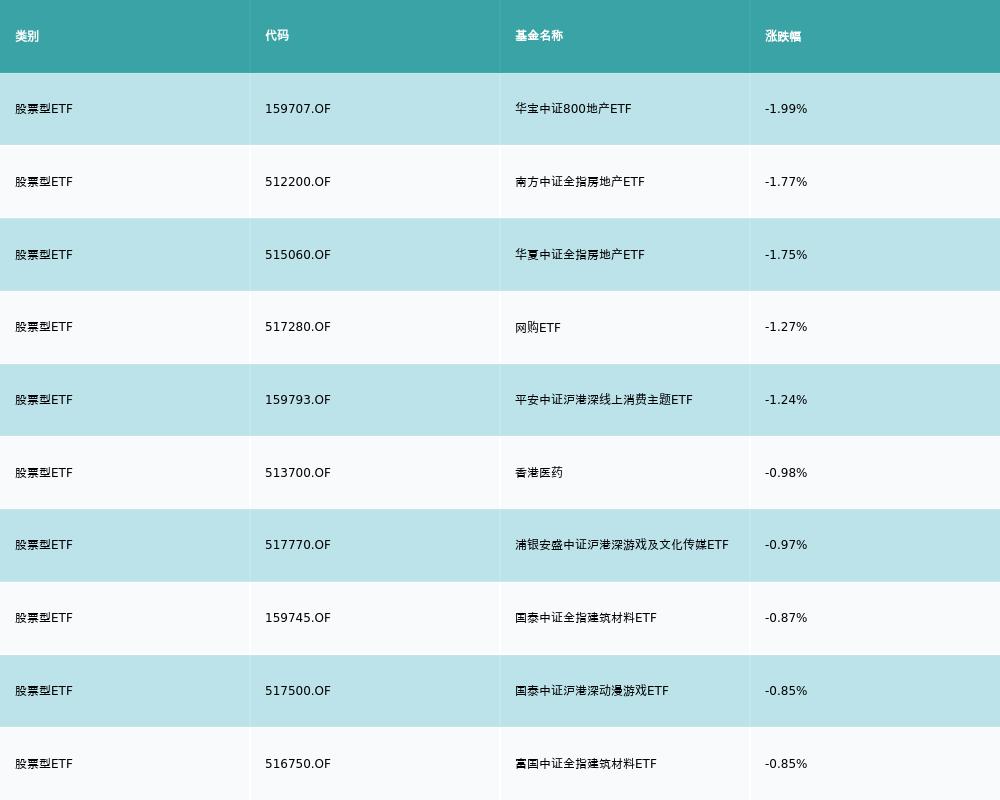 昨日股票型ETF跌幅最大的3支ETF及其收益率分别为:华宝中证800地产ETF(-1.99%)、南方中证全指房地产ETF(-1.77%)、华夏中证全指房地产ETF(-1.75%)。跌幅前10详情见下表: