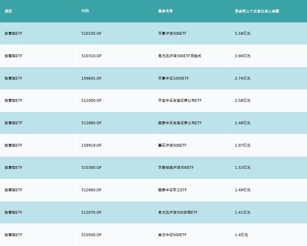 昨日股票型ETF资金流入最多的3支ETF及其流入金额分别为:华夏沪深300ETF(流入5.58亿元)、易方达沪深300ETF发起式(流入3.94亿元)、华夏中证1000ETF(流入2.74亿元)。资金流入前10详情见下表: