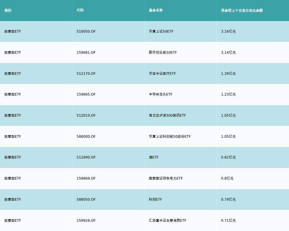 昨日股票型ETF资金流出最多的3支ETF及其流入金额分别为:华夏上证50ETF(流出3.16亿元)、鹏华创业板50ETF(流出3.14亿元)、华宝中证医疗ETF(流出1.39亿元)。资金流出前10详情见下表: