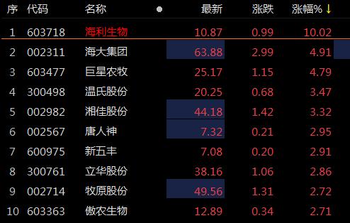 畜牧业板块股早盘走高,截至发稿,海利生物涨停,巨星农牧拉升涨近5%,海大集团、温氏股份、湘佳股份、唐人神等纷纷走高。