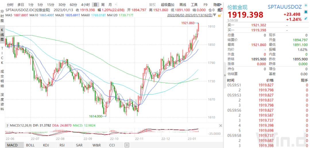 近期有色金属行业走势也比较强,受到资金的关注。尤其是黄金,目前伦敦黄金现货价格已经突破了1900美元。