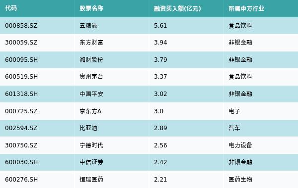 1月17日,两市共有3108只个股有融资资金买入,其中五粮液、东方财富、湘财股份排名前三,买入金额分别5.61亿元、3.94亿元、3.79亿元。融资买入额前10个股详情见下表: