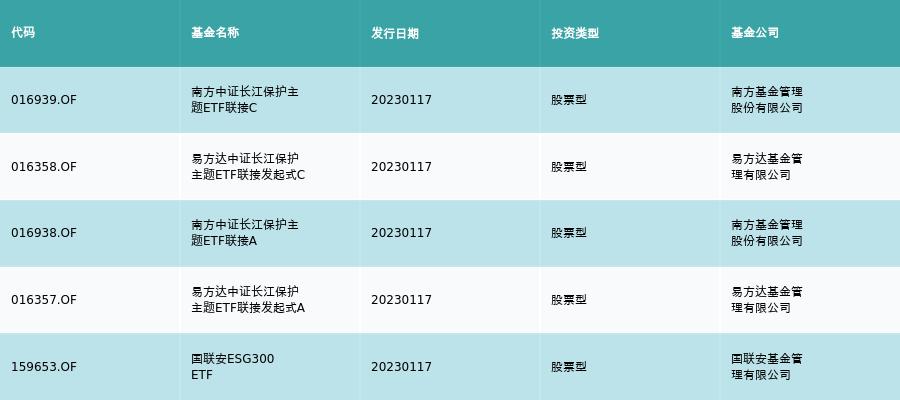 1月17日,有5只新基金发行,分别为:南方中证长江保护主题ETF联接C、易方达中证长江保护主题ETF联接发起式C、南方中证长江保护主题ETF联接A、易方达中证长江保护主题ETF联接发起式A、国联安ESG300ETF,详情见下表: