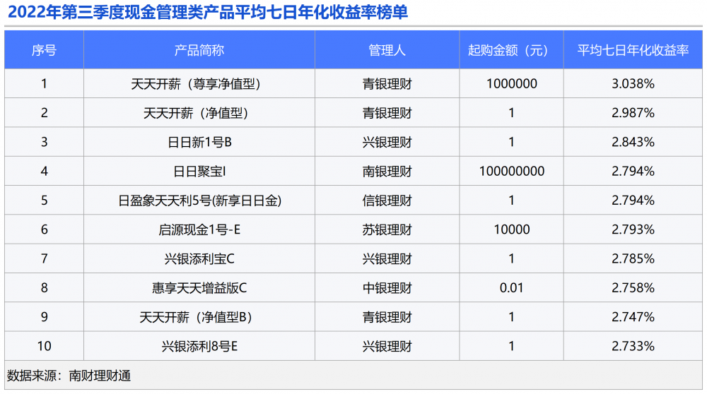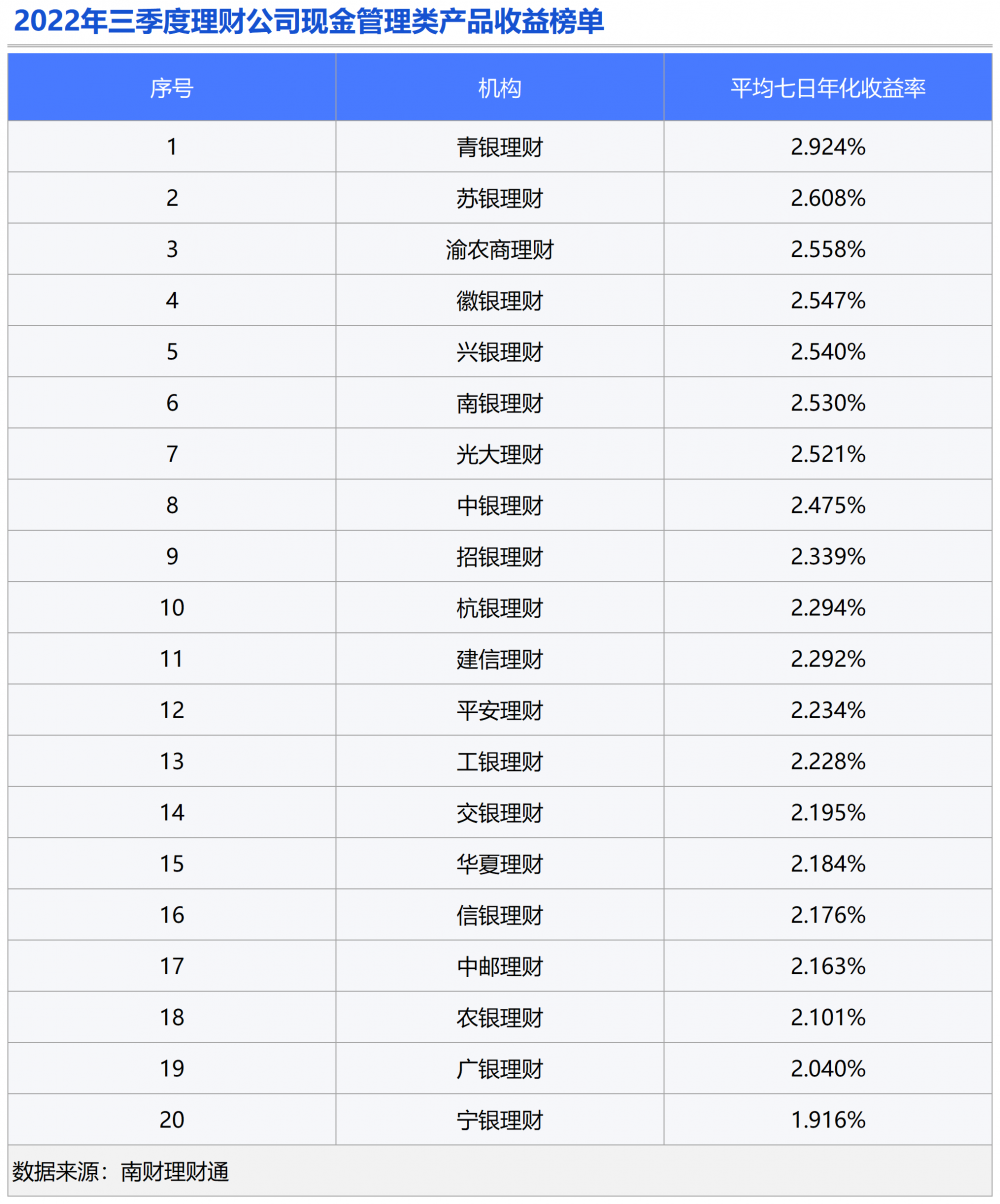 从2022年三季度收益水平来看,仅青银理财现金类产品平均七日年化收益率达2.924%,其他理财公司收益均未达2.7%。