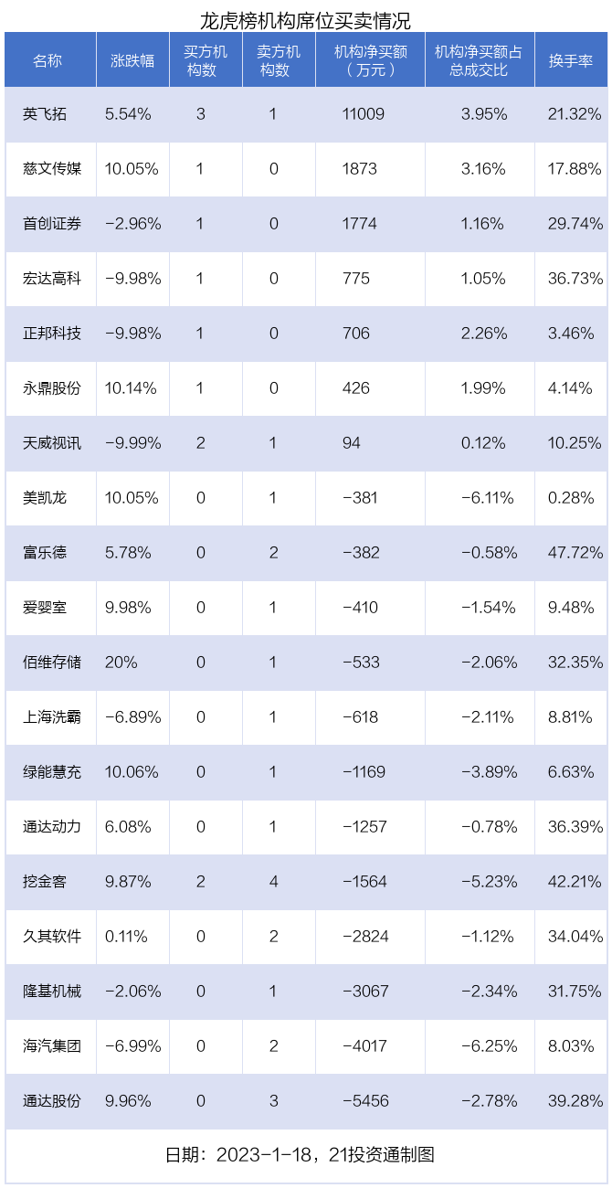 1月18日,19只个股龙虎榜出现了机构的身影,机构合计净卖出5023.27万元。具体来看,机构净买入7股,净卖出12股。