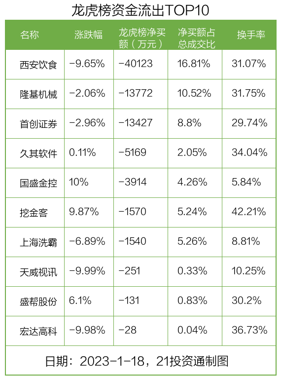 而龙虎榜中资金净流出最多的是西安饮食(000721.SZ),被净卖出为4.01亿元,占总成交金额的16.81%。西安饮食收盘下跌9.65%,换手率为31.07%。