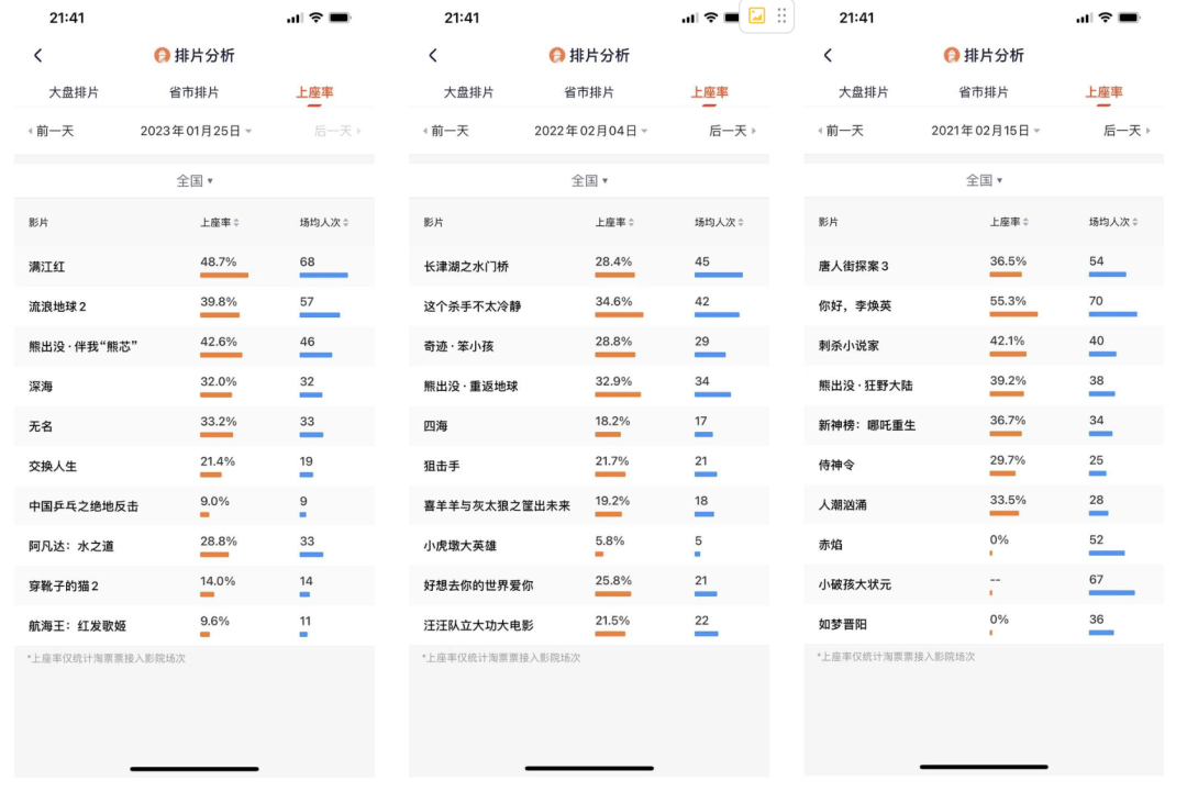 2023、2022、2021年春节档上座率同期对比