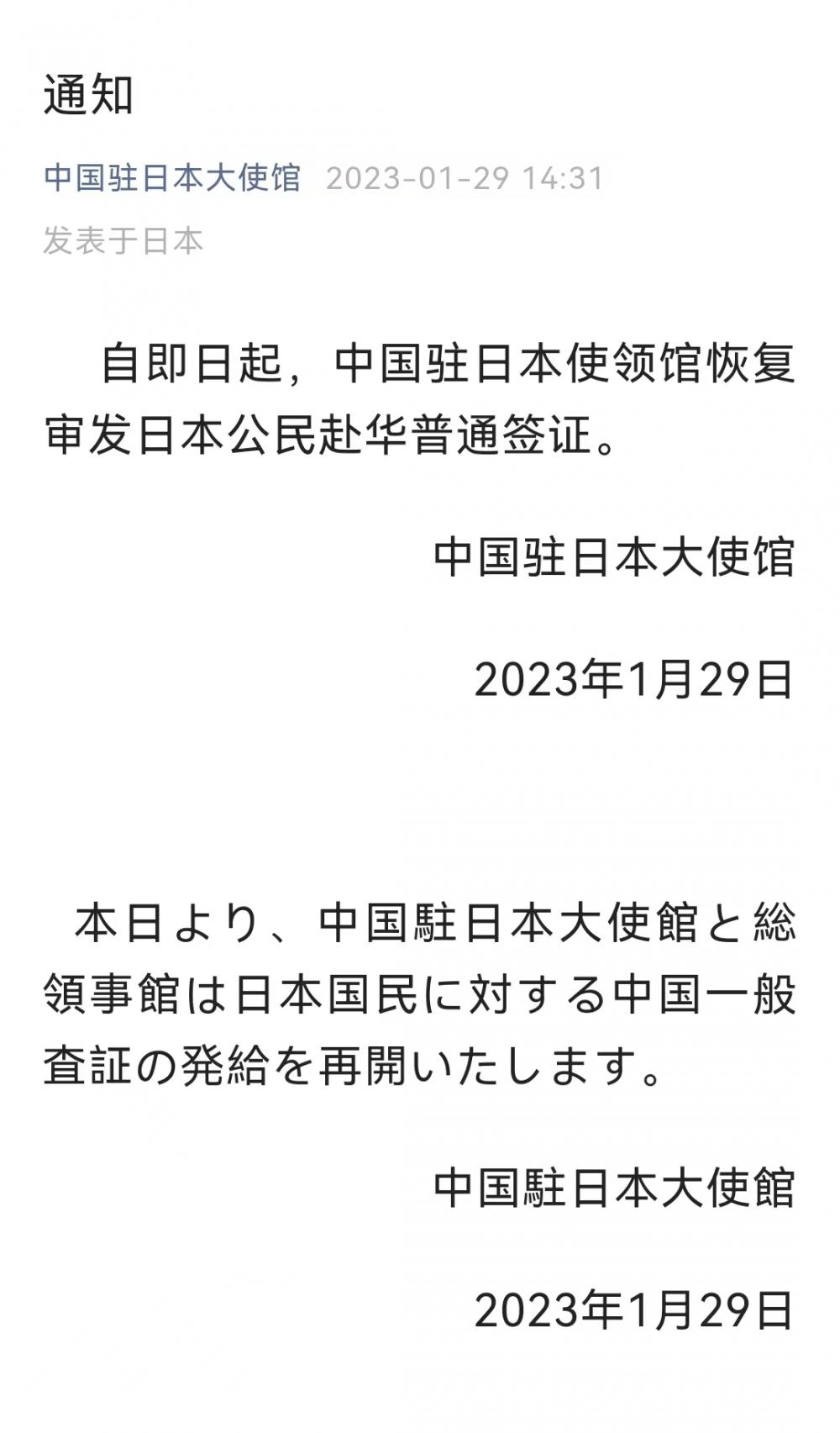 1月29日,中国驻日本大使馆微信公众号消息:自即日起,中国驻日本使领馆恢复审发日本公民赴华普通签证。
