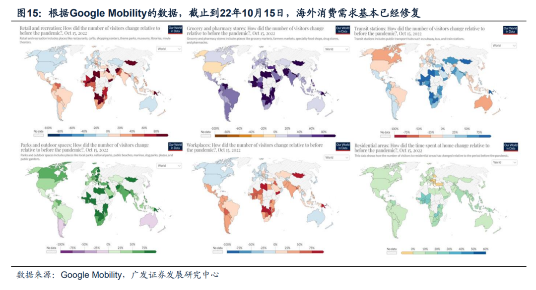 根据Google Mobility的数据,截止22年10月,海外消费需求基本已经修复。海外多数国家的零售娱乐场所、市场、交通站、公园等消费场所人流量恢复到疫情前水平,居家时间相对疫情前仅有小幅增长。