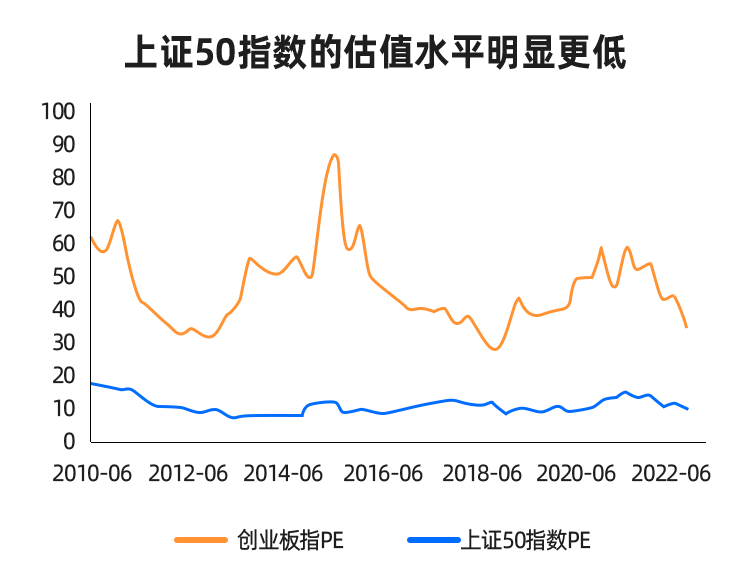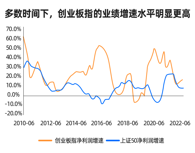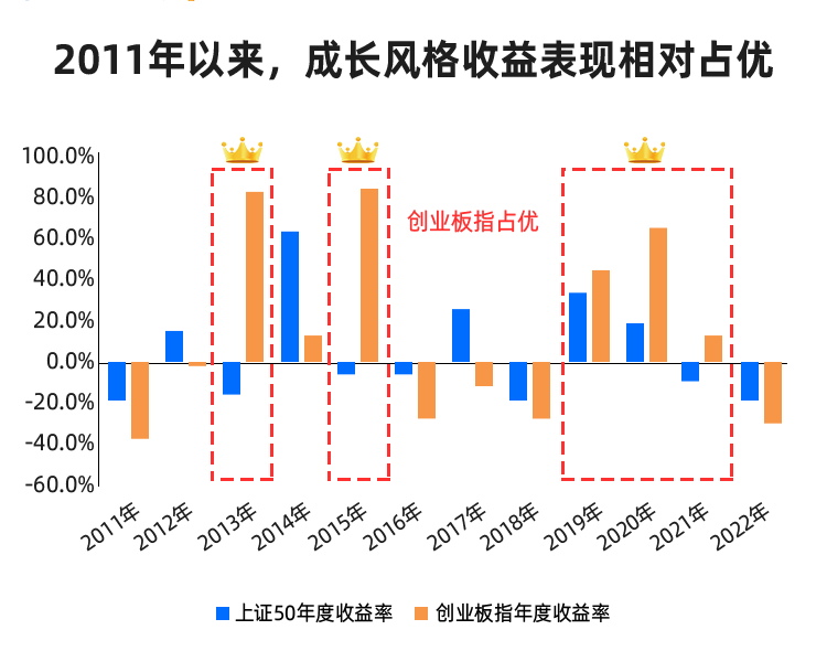 回看2011年以来创业板指和上证50指数的市场表现,虽然上证50指数相对占优的年份更多,但整体年化收益仅有2.4%,而创业板指数的年化收益达6.2%。