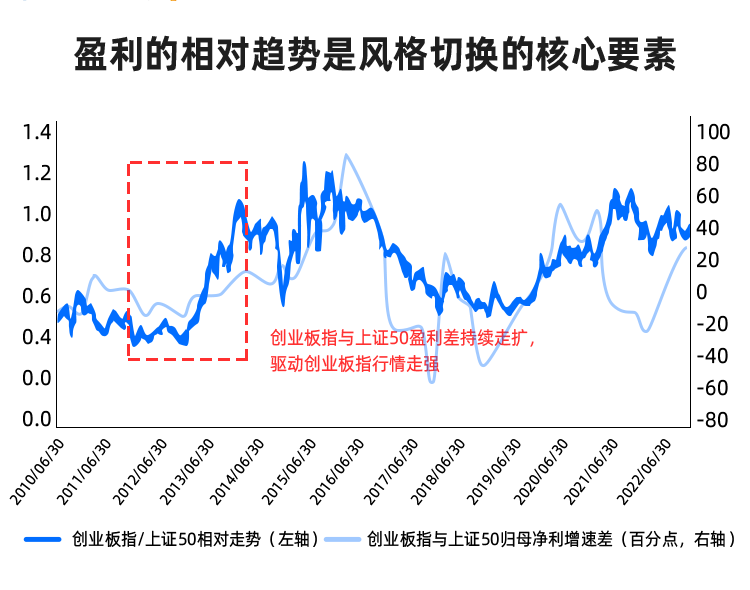 比如2019年-2021年,随着创业板指和上证50指数的盈利增速差持续走扩,创业板指相对上证50指数也在持续走强。
