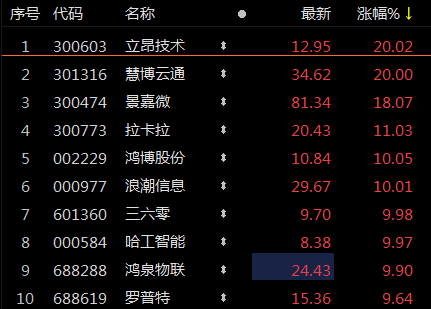 2月9日,人工智能持续走强,板块内部掀涨停潮。截至发稿,立昂技术、慧博云通“20CM”涨停,景嘉微、拉卡拉涨超10%,鸿博股份、浪潮信息、三六零、哈工智能等涨停。