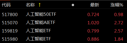 ETF方面,人工智能AIETF(515070)、人工智能ETF(159819)等涨近3%。