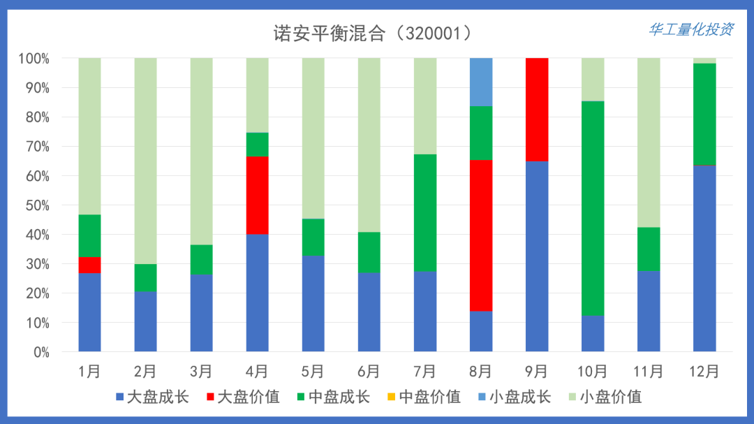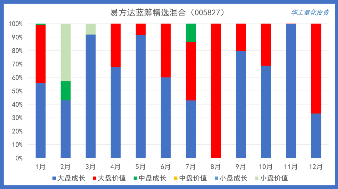 图表中的柱状的长度反映是该月风格的配比大小。比如易方达蓝筹混合精选在1月约55%是大盘成长风格,在8月几乎全部是大盘价值风格。