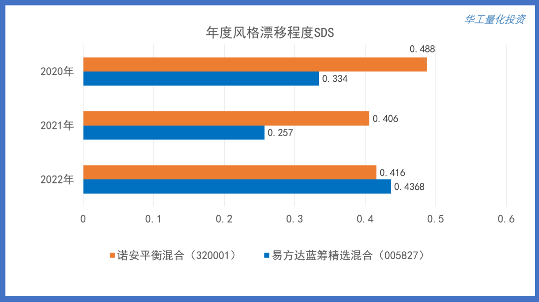 可以看到,在2020年和2021年,诺安平衡混合基金的风格漂移程度比易方达蓝筹精选混合基金要大,而在2022年,易方达蓝筹精选混合基金的风格漂移程度又比诺安平衡混合基金要大一些。