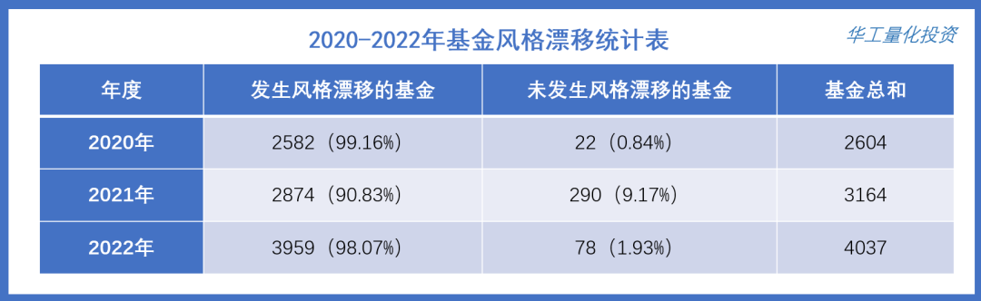 (3)2022年度,发生了风格漂移的基金有3966支,占该年度样本总基金的98.07%。