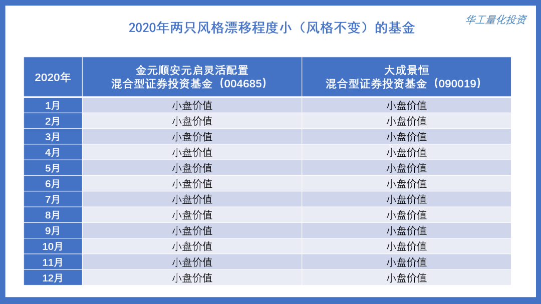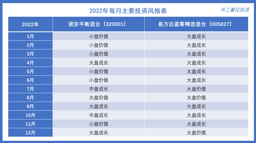 我们对比每个月各个系数的大小,定义系数最大的风格因子为基金该时期段的投资风格,那么可以得到两只基金2022年度在各月份的投资风格情况如下: