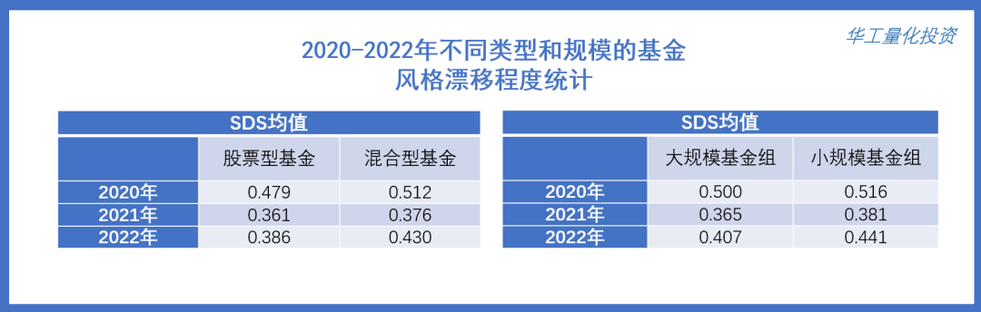 可以发现在我们的样本中,大规模基金组在近三年的SDS均值都要略小于小规模基金组,说明在近三年内大规模基金组的风格漂移程度要略微小于小规模基金组。