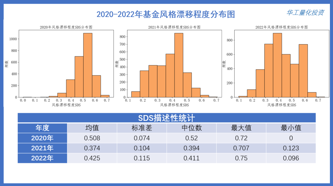可以看出,2020年与2021年、2022年相比,样本基金总体明显发生了较大程度的风格漂移。通过SDS值的描述性统计,我们也发现2020年SDS均值达到了0.508,大于2021年和2022年的SDS均值,且SDS值主要分布在0.3-0.7区间,分布得比较集中,标准差仅为0.074,说明2020年度基金市场普遍存在着较大程度的风格漂移。