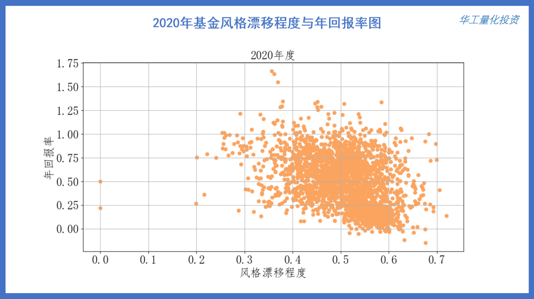 本文选用年回报率来代表基金业绩,计算样本基金每年度的风格漂移程度和年回报率,并依据这两种数据绘制出散点图,图上每一个点都代表着该年度的一支样本基金: