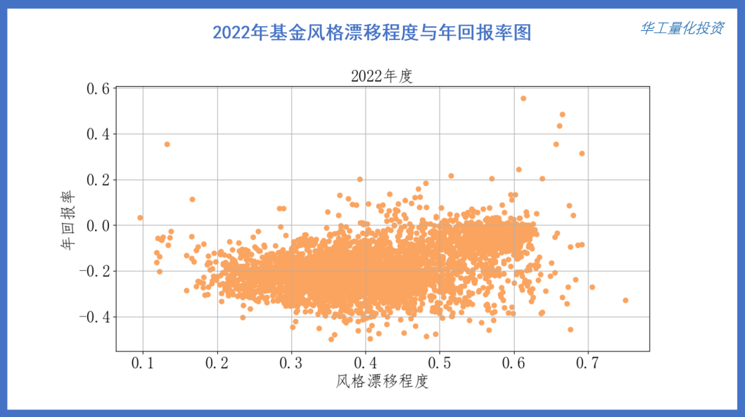 通过散点图可以发现,在2022年,当基金的风格漂移程度较小时,盈利或亏损要较小,而随着基金的风格漂移程度不断增大,收益增多和亏损变大的情况都有可能会发生,这与2021年的散点图所得出的结论相似:越大的风格漂移程度并不意味着一定会伴随着更高的收益,反而可能带来更大的亏损。