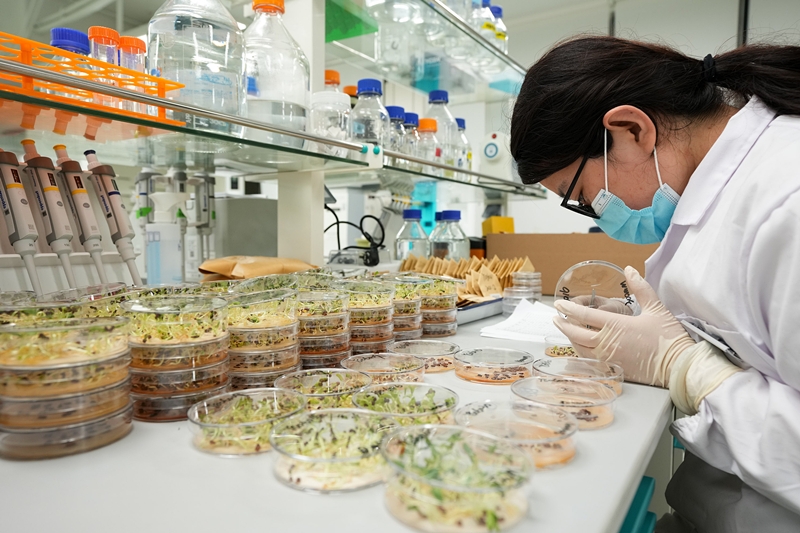 2022年4月11日,海南三亚崖州湾科技城的崖州湾种子实验室,科研人员正在观察种子样本。