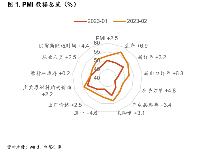 1. 2月PMI的大幅提升反映出年后经济较高的环比修复斜率。供给端的快速修复展现了我国制造业产业链供应链的韧性,为经济的进一步修复打下良好基础。