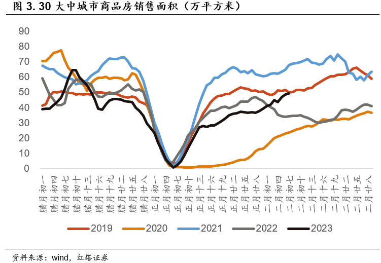 三是地产回暖带动地产后周期以及原材料行业修复。在低贷款利率以及宽松购房政策的刺激下,多地房屋销售回暖,2月30大中城市商品房销售面积均值环比提高37.3%,同比提高26.0%。房价也出现了积极信号,全国百城新建住宅平均价格环比持平,止住“7连跌”态势;百城二手住宅平均价格环比微跌0.01%,跌幅较1月收窄0.1个百分点。同时,在员工到岗率回升,以及保交楼政策推动下,地产施工加速。2月21日房建开复工率已达到84.1%。