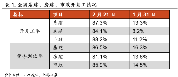 供给端方面,生产、采购、原材料库存、从业人员以及供货商配送时间指数分别环比提高6.9、3.1、0.2、2.5和4.4个百分点,显示随着节后居民返工,人流物流恢复,劳动力供给约束明显改善,企业在加快复工复产。据百年建筑调研,截至农历二月初二(2月21日),全国劳务到位率为83.9%,较农历同期增加2.8%;开复工率为86.1%,较农历同期增加5.7%。