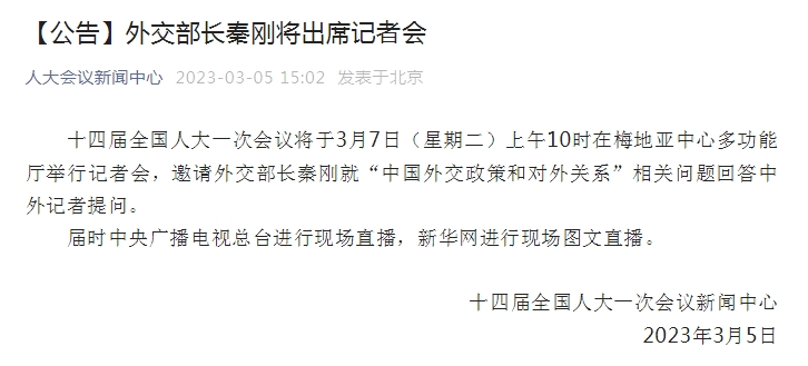 十四届全国人大一次会议将于3月7日(星期二)上午10时在梅地亚中心多功能厅举行记者会,邀请外交部长秦刚就“中国外交政策和对外关系”相关问题回答中外记者提问。