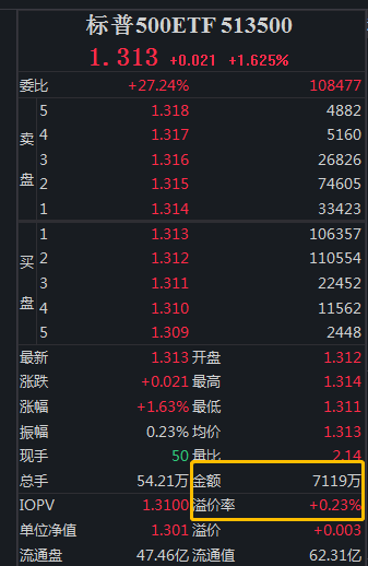 今日,截至发稿,标普500ETF(513500)涨1.63%,盘中交易持续溢价,溢价率0.23%,成交额超7000万,交投活跃。