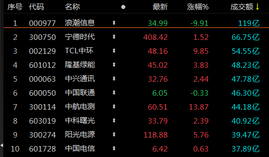沪深两市今日成交额9509亿,较上个交易日放量814亿。热门个股方面,浪潮信息成交额119亿元居首,宁德时代、TCL中环、隆基绿能等成交额居前。