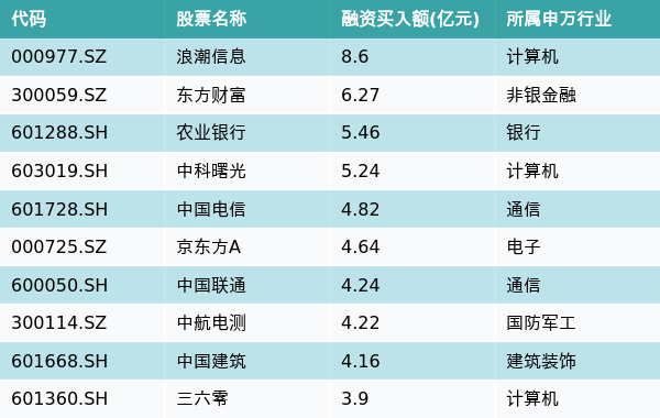 3月7日,两市共有3123只个股有融资资金买入,其中浪潮信息、东方财富、农业银行排名前三,买入金额分别8.6亿元、6.27亿元、5.46亿元。融资买入额前10个股详情见下表: