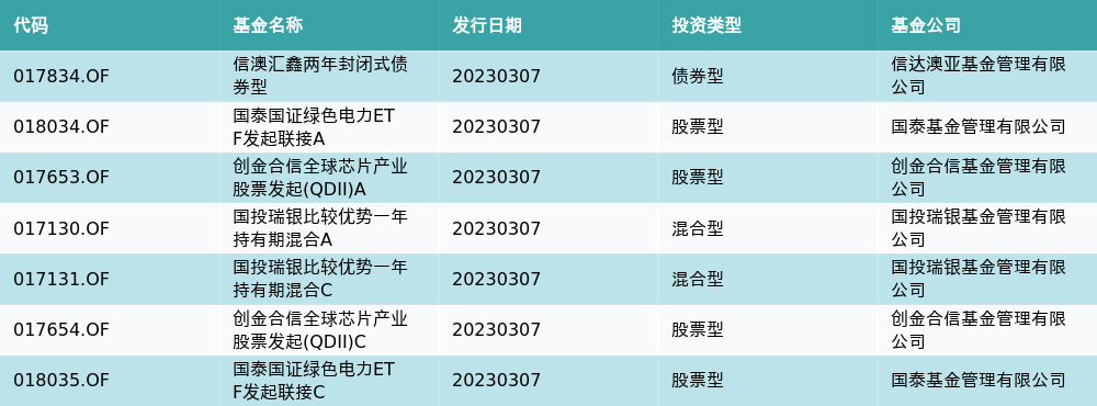 3月7日有7只新基金发行,分别为:信澳汇鑫两年封闭式债券型、国泰国证绿色电力ETF发起联接A、创金合信全球芯片产业股票发起(QDII)A、国投瑞银比较优势一年持有期混合A、国投瑞银比较优势一年持有期混合C、创金合信全球芯片产业股票发起(QDII)C、国泰国证绿色电力ETF发起联接C,详情见下表: