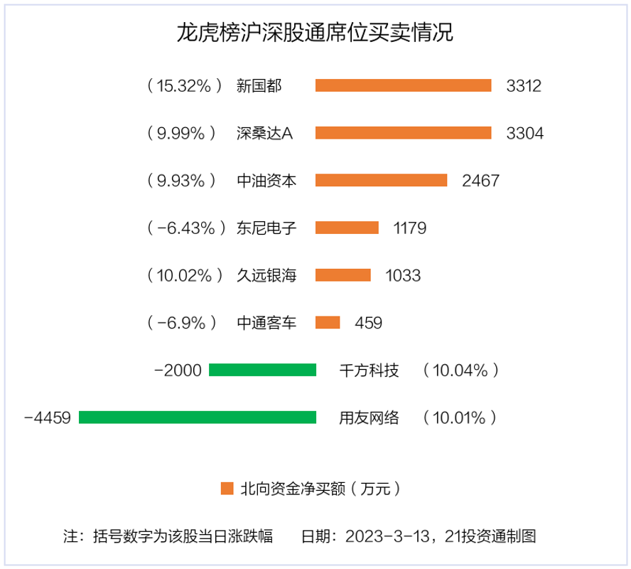 北向资金净买入金额最多的是新国都(300130.SZ),净买入3312.2万元,占总成交金额的2.52%。净卖出金额最多的是用友网络(600588.SH),为4459.18万元,占总成交金额的2.83%,当日收盘上涨10.01%,换手率为1.73%。