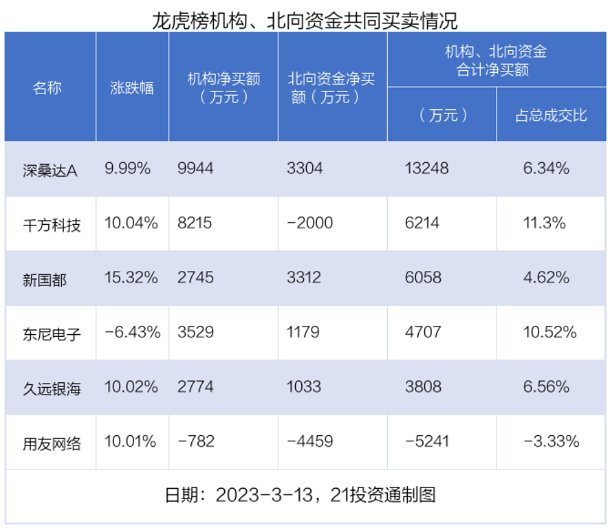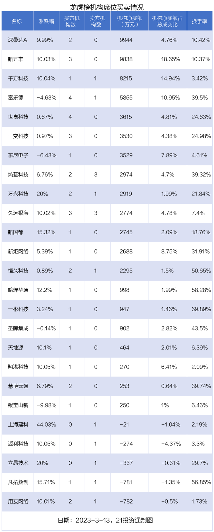 其中,机构净买入金额最多的是深桑达A(000032.SZ),当日收盘上涨9.99%,换手率为10.42%。