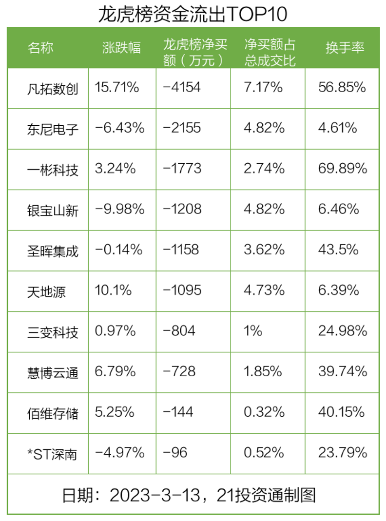 而龙虎榜中资金净流出最多的是凡拓数创(301313.SZ),被净卖出为0.42亿元,占总成交金额的7.17%。凡拓数创收盘上涨15.71%,换手率为56.85%。